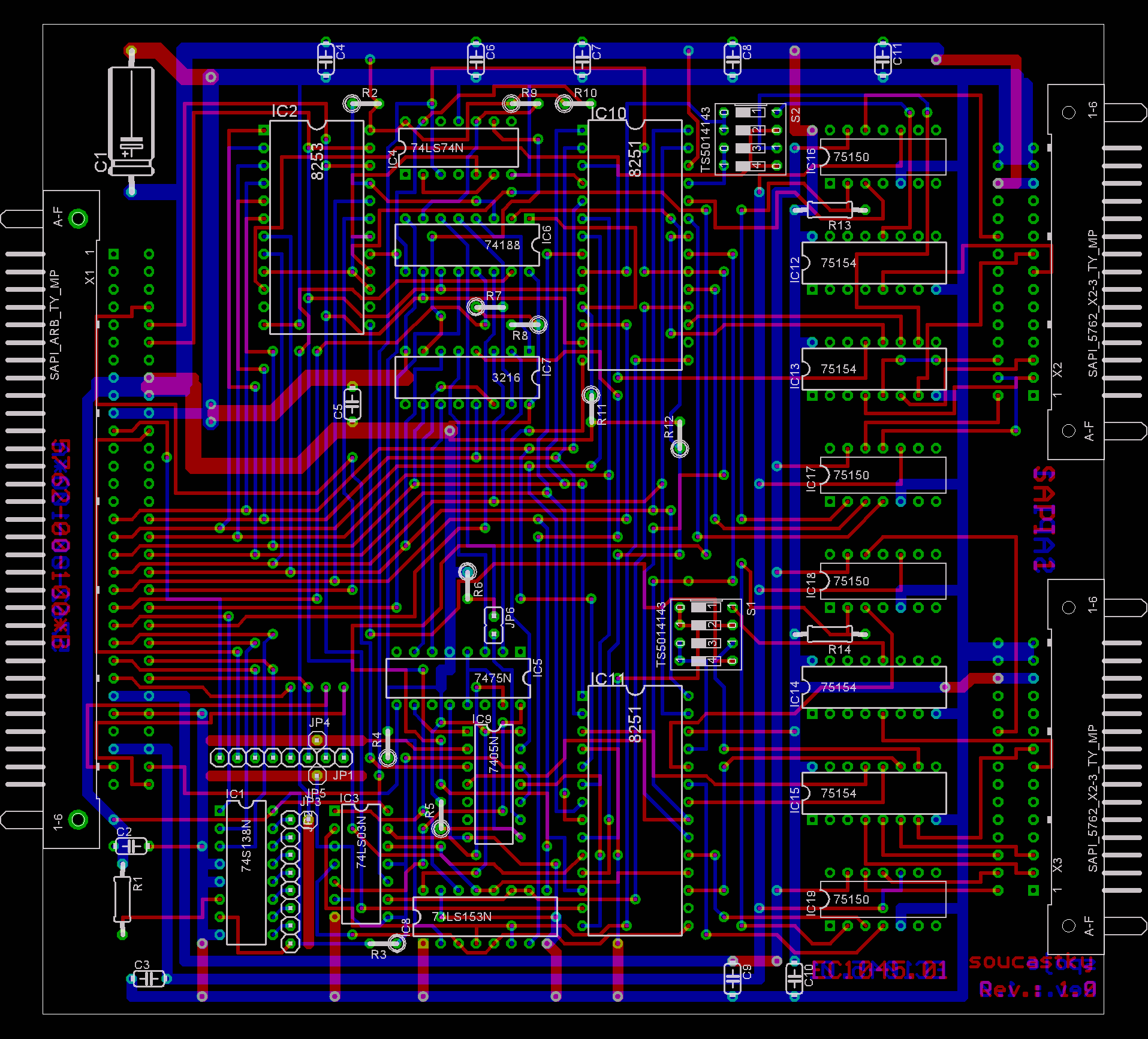 Na desce je několik chyb … zkrat u C2 (opraveno), chybějící spoj VCC u X3 (opraveno) chybějící odpor u IC9B (7405) (neopraveno) …